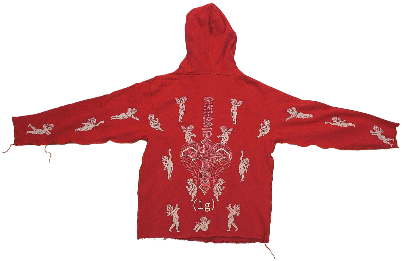 Long sleeves RED hooded sweatshirt with white angels embroidered all over. WUNJI logo embroidered at chest. Blessed and Highly Favored cross embroidered on back.