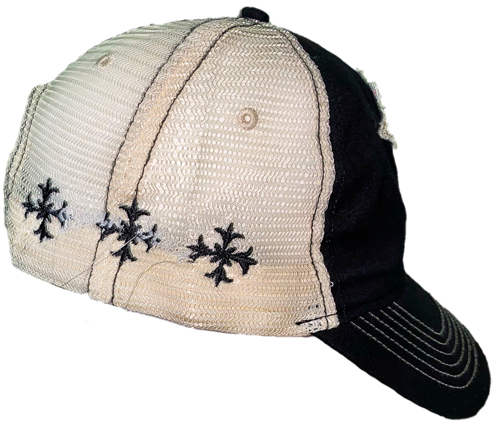 Trucker cap white mesh black cotton hat. Glow in the dark star embroidered at front. Red B embroidered at front. Born Star cursive embroidery at side, black crosses embroidered at side. WUNJI label sewn at side of hat. Rigid brim.