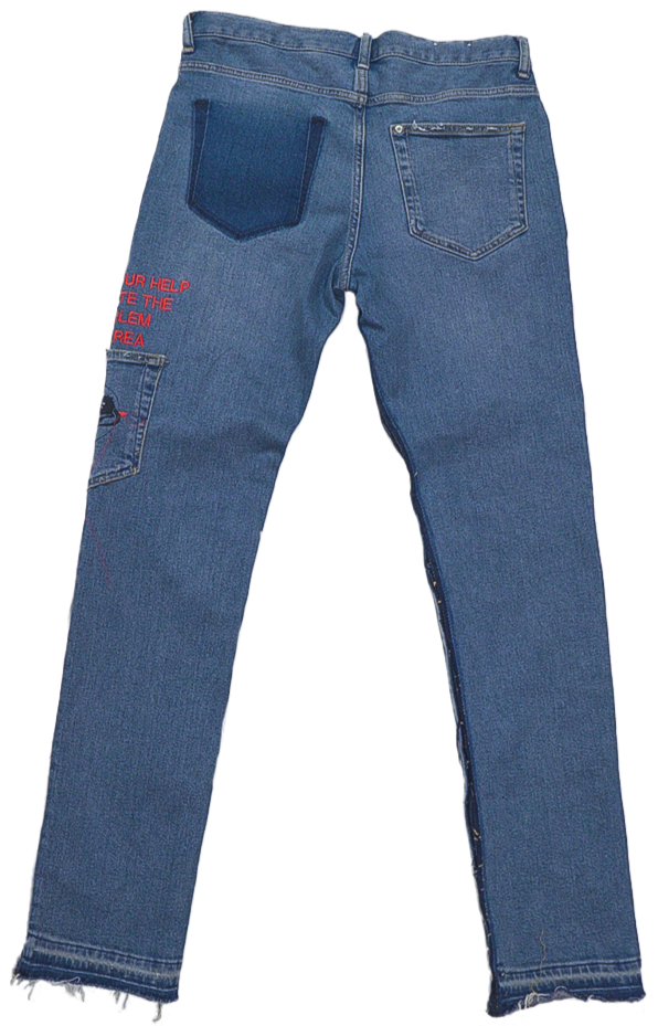 Long pants in vintage blue wash denim. Target Rats logo patch and (WE NEED YOUR HELP TO ELIMINATE THE RT PROBLEM IN THIS AREA) embroidered at side. Chicago Department of the skreets embroidered at front leg. Five-pockets styling. Belt loops. Button closure. Zip fly. Slim fit.