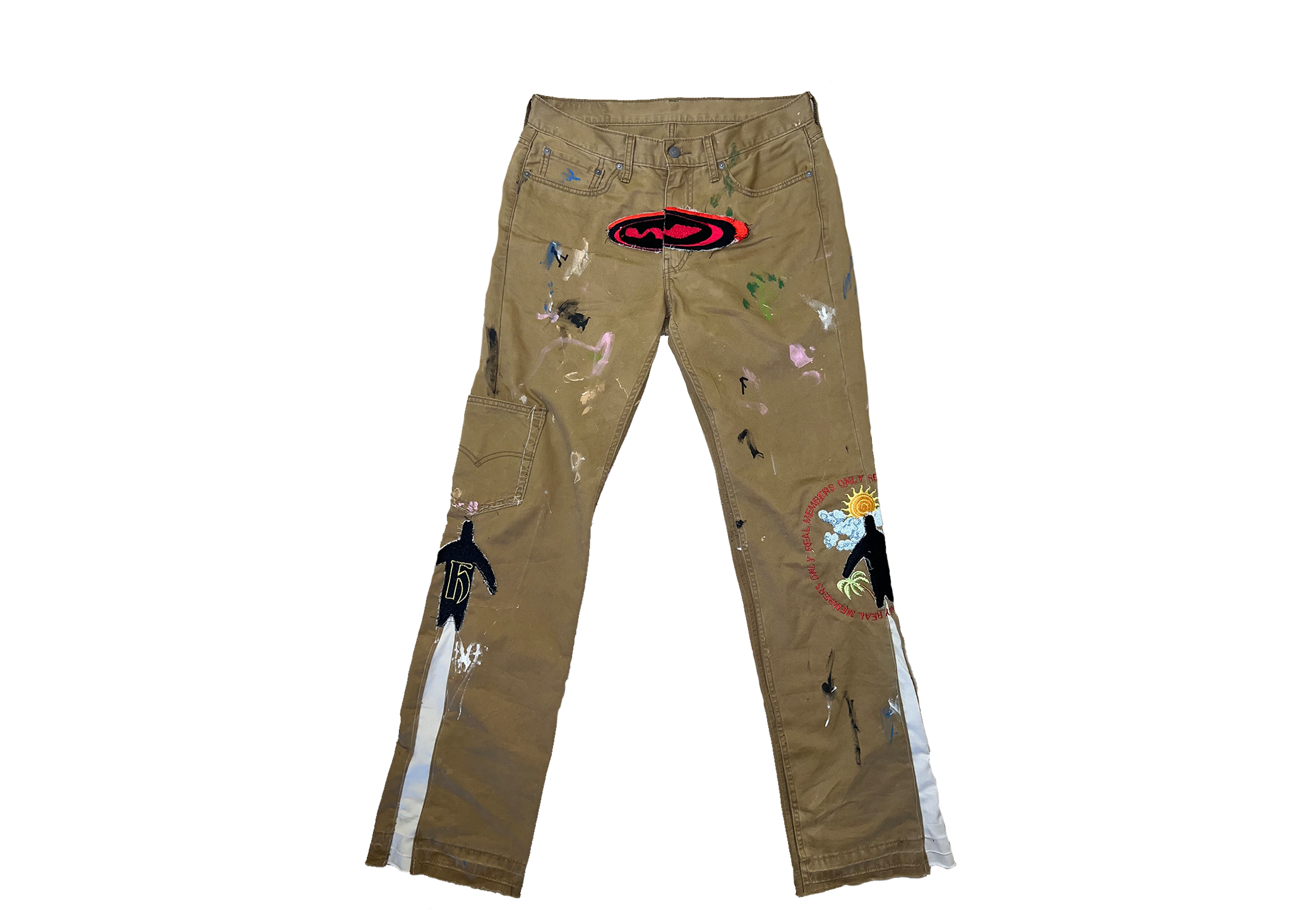 The WUNJI HALSI WORK PANTS are hand picked vintage wear and tear work Levis deconstructed in Chicago and then hand painted in Miami. The WH Work Pants feature slim straight fit with a slight flared leg opening. The WH Work Pants features embroidery on the side of the legs with an extra side pocket. The WH Work Pants also features an chenille patch on the front of zipper. In regards to sizing we suggest to go with your normal size for Levis.