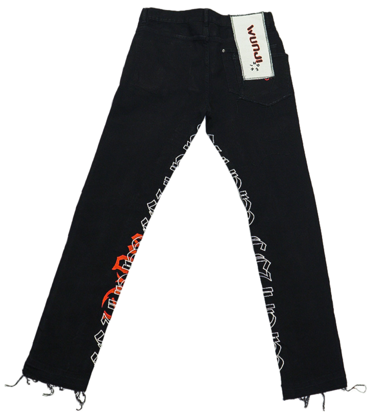 Long black denim pants. WUNJI logo embroidered on the inside legs in white and red. ( 1g ) logo embroidered at front leg. White denim tag with embroidered wunji denim logo at back waistband. Red (1g) embroidered on back pocket. Five-pockets styling. Belt loops. Button closure. Zip fly. Slim fit.